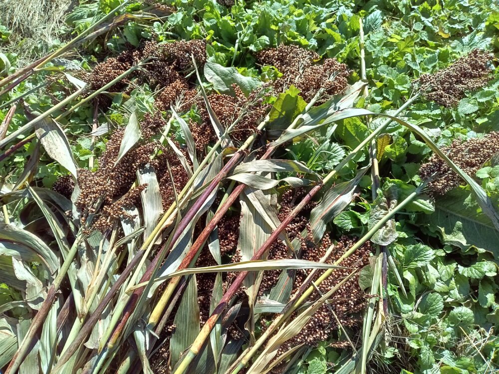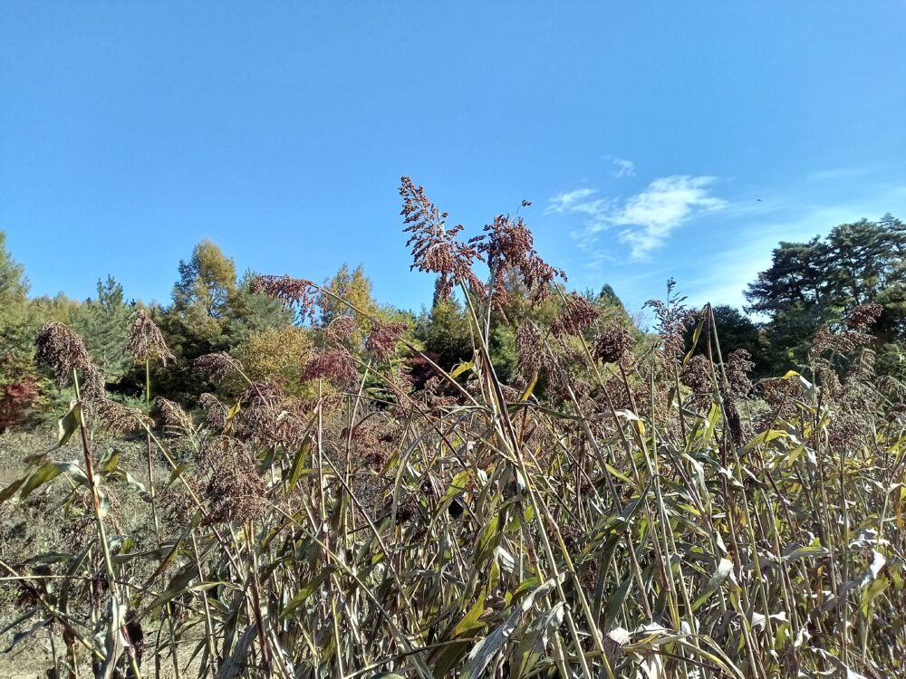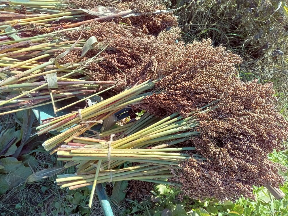 収穫の季節も終盤になり、今回はたかきび(ソルガム)もち種の刈り取りを行いました。機械で刈り取ることができないため手刈りです。