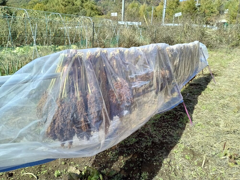 ↑最後に稲のはざがけに使ったはざがけ棒に掛けて、シートをかけて作業終了です。奥のほうに見えるのは少し前に刈り取りしたもちきびです。
